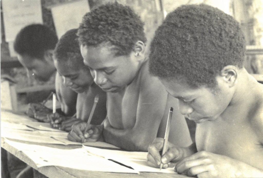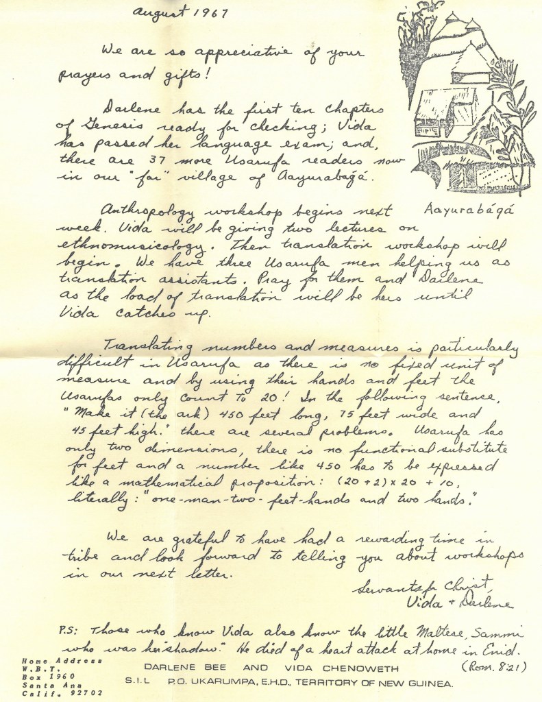 After completing the SIL course and additional biblical studies at Asbury Theological Seminary in 1963, Vida traveled to Papua New Guinea the following year, where she met her new Wycliffe partner, Dr. Darlene Bee. Since 1958, Bee had been working on translating the Usarufa language, spoken by 800 to 900 people in the country’s eastern highlands. Although language and literacy work formed the core of Vida’s time with the Usarufa, music was never far from her thoughts. Immersed in the Usarufa’s distinctive musical culture, she began to explore how the long Christian tradition of praise and worship could be translated in way that preserved and encouraged indigenous musical systems.
