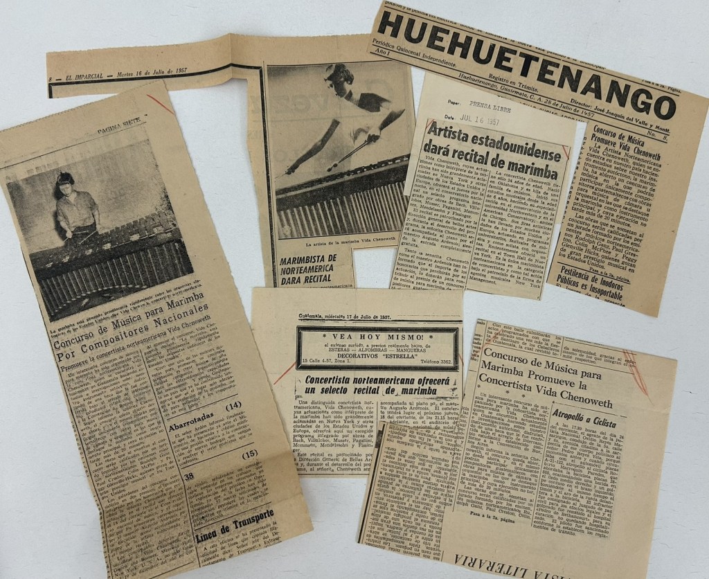 After Vida’s success in Chicago and New York, she won a Fulbright Scholarship in 1957 to study the marimba in Guatemala. Along with a busy schedule of performances across Guatemala and Mexico, Vida conducted a historical and musical analysis of the development of the marimba, culminating in her 1964 publication The Marimbas of Guatemala. Several clippings books in the Chenoweth papers document the extensive press coverage of this early performance tour, along with her later concerts around the world.