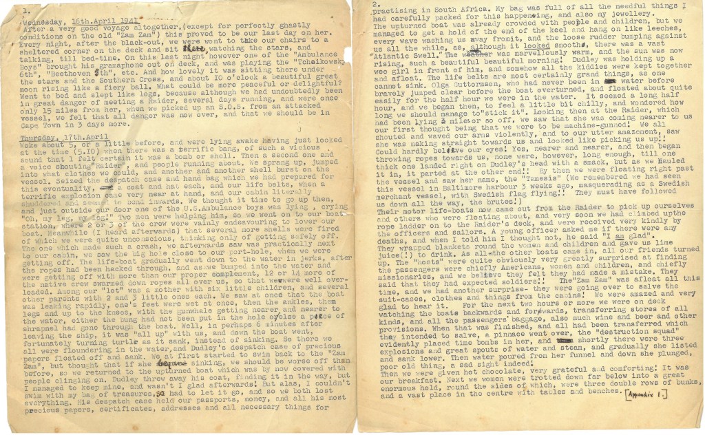 The diary, with numerous handwritten additions, was kept by Ethel Wright. She was a British citizen traveling with her doctor husband Dudley to Durbin, South Africa. Her diary gives a detailed account of all the Zamzam internees experienced, from the time the Zamzam was attacked until Ethel and Dudley were able to sail from Portugal for South Africa fifteen months later (Because Dudley was 75 and Ethel 70, they were allowed to leave by the Germans). It seems unlikely that Ethel was able to keep a typewritten record while she was confined, especially since she and Dudley had lost all their possessions in the attack. But perhaps she had an opportunity to type the record from a handwritten diary soon afterwards. She certainly was the one who added the handwritten notes. Her diary is a vivid record of the terror of the attack, the strangeness of war-torn Europe and the boredom and uncertainty of internment. The Wrights were able to get to South Africa on the second try. After the war, they returned to England where Dudley died in 1948.