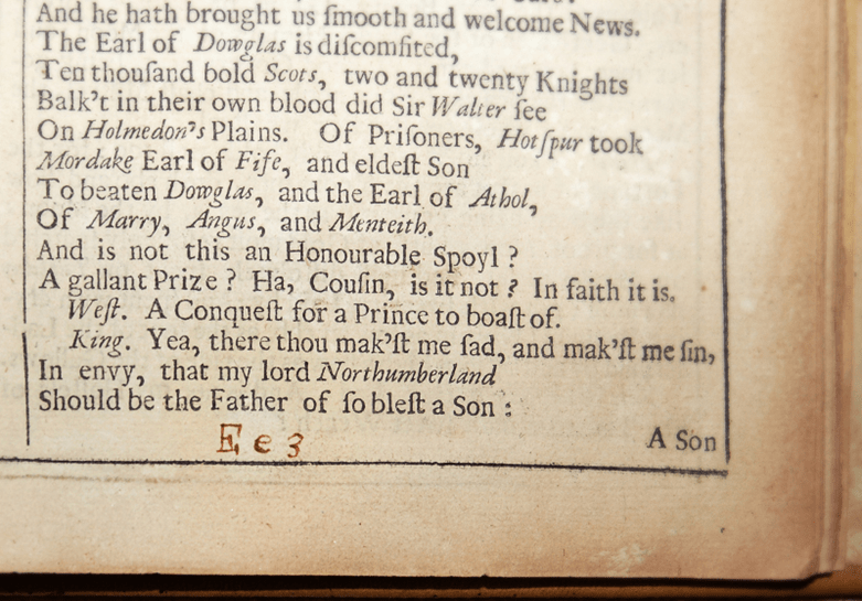 To publish Shakespeare’s fourth folio, Herringman employed three printing houses to produce a section of it. The plays in our copy are taken from the second section, which is particularly interesting due to its errors in layout. More specifically, there were many mistakes made in labelling the signatures. These combinations of letters and numbers in the bottom right corners of certain pages determined the format of the book, and so it was important that they be precise. Our copy of The First Part of Henry IV features an example of such an error on folio 41: the signature “Ee3” had been mistakenly left off the page, but here someone (likely from the printing house) has corrected it by hand with ink.