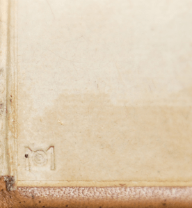 Determining the papermaker, on the other hand, was a bit trickier. Such details aren’t listed in imprints and there was nothing in the inscription. Yet when held up to the light, it became clear that, consistent with folios from the era, our book was printed on antique laid paper with vertical chain lines. Upon closer inspection, I saw a watermark: