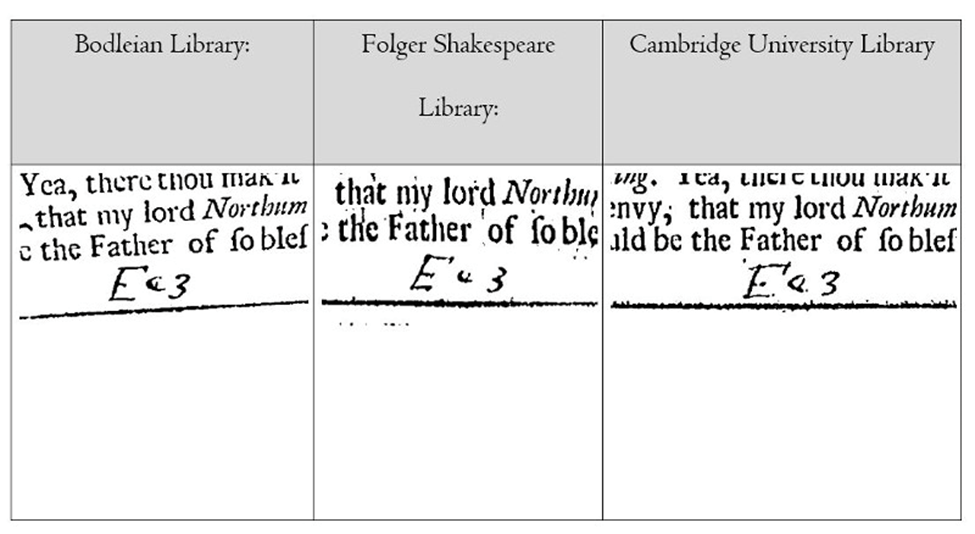 A second certain remark is that none of the other aforementioned copies of the fourth edition have these mistakes on this page. The books at the Bodleian Library, Folger Shakespeare Library, and Cambridge University Library all have the italic “S” instead of the roman, the correct “u” in sudden, and while the quality of the EEBO scans makes it tricky to determine for sure, it seems as though all also have a space between “Henry” and the colon.