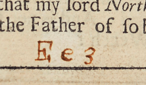 Scholar Giles E. Dawson examined nearly 40 copies of this folio, and in the majority of them “Ee3” was added in this way. He notes that the handwriting is the same in all the copies he examined, and that it is most distinctive in this particular signature.2