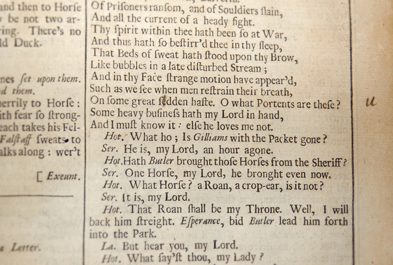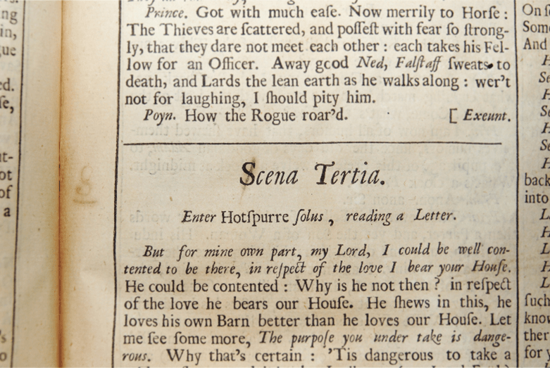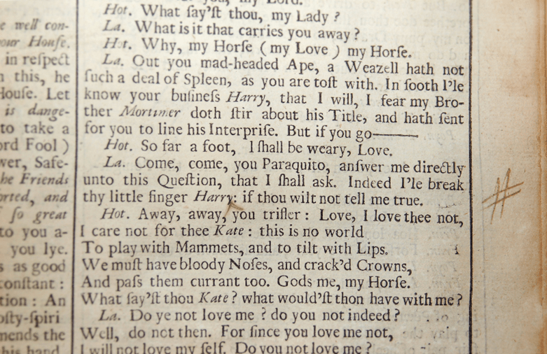 In another place in the book, we find more markings and they, too, highlight some strange particularities. Folio 47 features parts of two scenes from The First Part of Henry IV which someone has marked up to note typographical and editorial issues. For example, the “S” in “Scena Tertia” is incorrectly printed in Roman, while the rest of the heading is italicized: