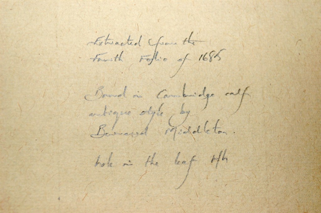The material composition of this book, on the other hand, is a mystery solved. As stated in the inscription, our copy was specially bound by Bernard Middleton, a renowned British binder who flourished in the twentieth century and literally wrote the book on English bookbinding. The work he did for our copy resulted in an elegant speckled calf leather binding with blind tooling and gilt letters, and he signed his work in the lower left corner of the back cover paste-down using his signature stamp.