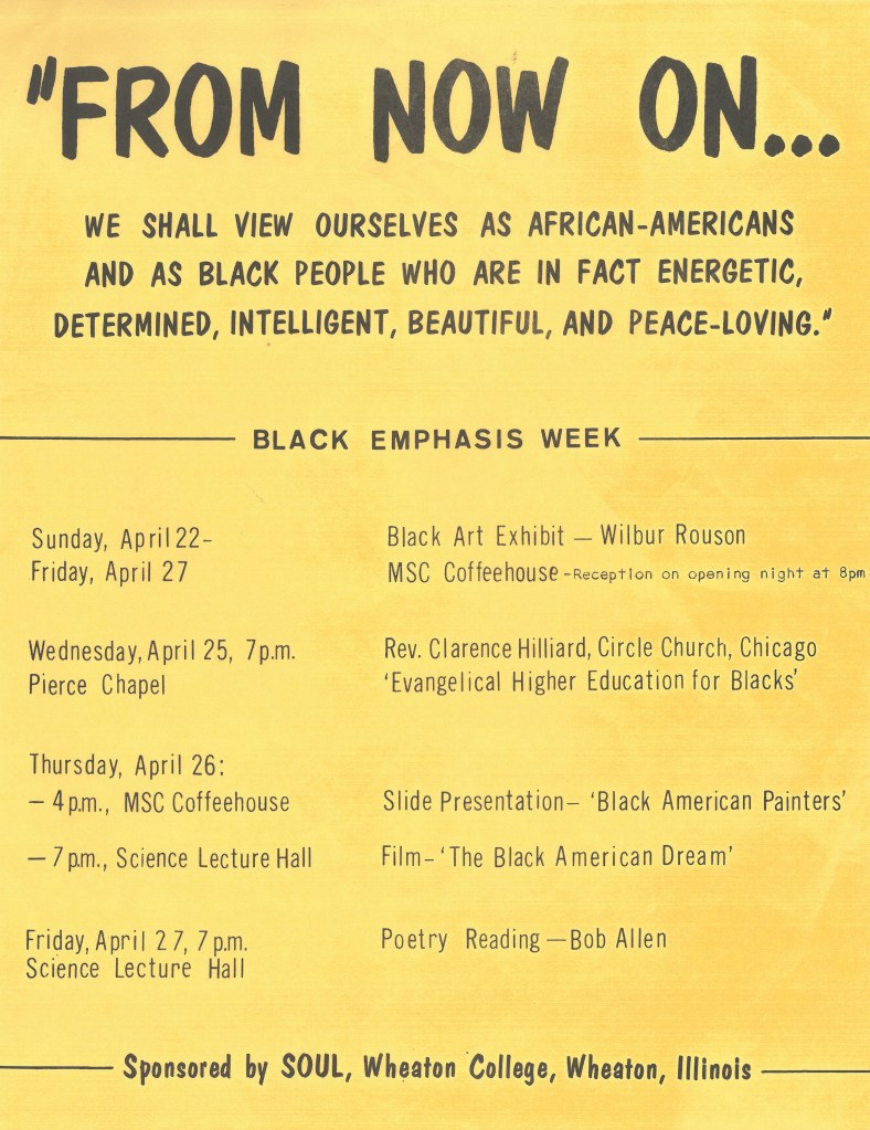 While Wheaton College had enrolled students of color since the 1860s, their numbers had typically remained small. The introduction of the Compensatory Education Program (CEP) in the fall of 1968 brought a notable increase of Black and Puerto Rican students to campus from urban centers around the United States, like Chicago or New York. Adjusting to life in suburban Wheaton, CEP students sought to form an organization that would both foster solidarity among minority students and educate a predominantly white campus community. Under the guidance of Dr. Ozzie Edwards, Wheaton’s only Black faculty member at the time, students founded the Student Organization for Urban Leadership (SOUL) in early 1969. The organization quickly turned its attention to planning a week-long celebration dedicated to Black art, music, and culture.