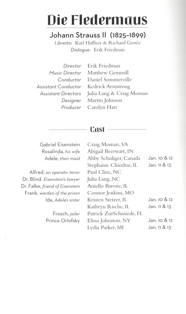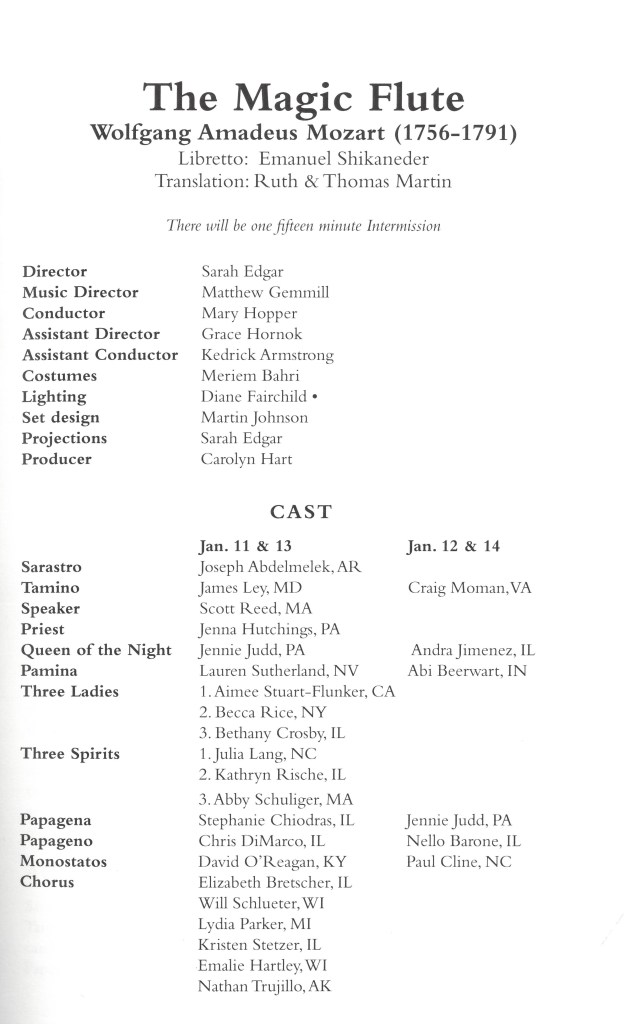 Every year, the Wheaton College Conservatory Voice Department provides masterful performances of an opera or musical as a requirement for their degree. Students perform a full Mainstage Opera (MUEP 357) every other year, and a musical, or double-bill of single-acts or smaller works for the years in between. The ensemble is cast late in the Spring semester, and incoming freshmen can audition for chorus parts upon their arrival in the fall. The students rehearse all through the Fall Semester with a performance in January, after which Opera Workshop or Opera Musical Theater (MUEP 356) begins with a performance near finals week of Spring Semester.