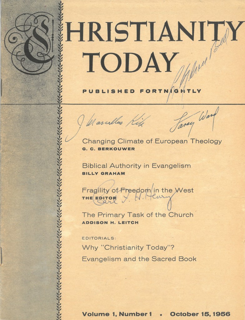 An autographed copy of the first issue, as well as correspondence, board meeting minutes, financial reports, memos, photographs, audio tapes, and other material mostly relating to the founding of the magazine and a wide range of religious, social, and political issues can be found in Collection 8: Records of Christianity Today, held here at the Wheaton College Billy Graham Center Archives.