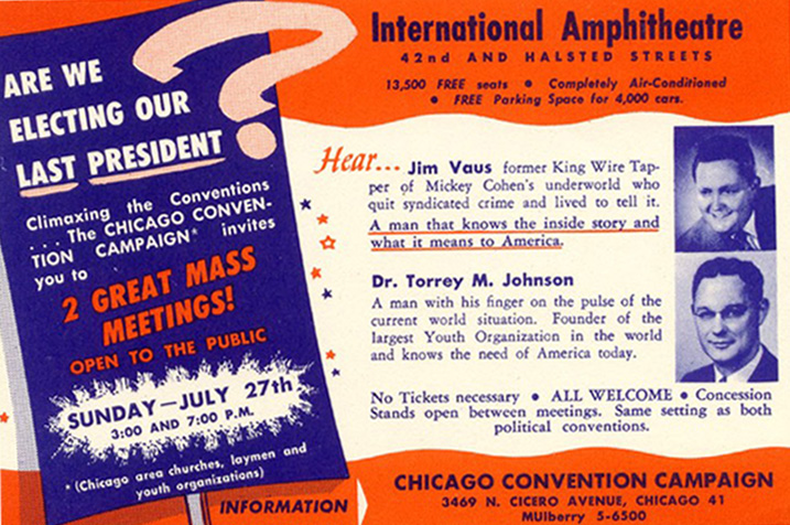 The event of a lifetime has become the opportunity of a lifetime!” So claimed the flashy mass marketing letter inviting one and all to the Chicago Convention Campaign. Spearheaded by Torrey Johnson, the tireless president of Youth for Christ, and drawing widespread support from churches and religious leaders across the Upper Midwest, the 1952 Convention Campaign offers a glimpse into mid-century mass evangelism efforts, particularly the potent combination of evangelistic and patriotic fervor.